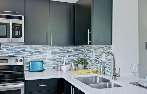 The 8ft Quartzite waterfall island is the anchor for this kitchen